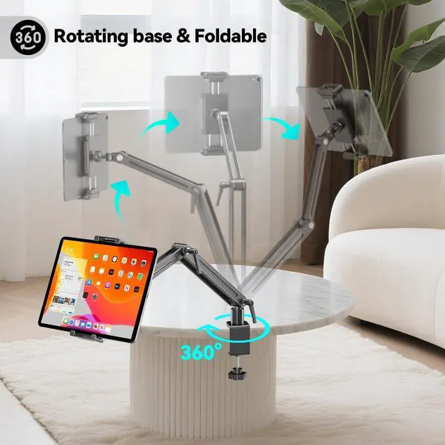 Load Capacity: Constructed from premium aluminum alloy, the portable tablet stand is lightweight yet extremely durable. Tablet arm can support up to 5.5 pounds, truly combining portability with sturdiness.