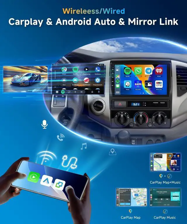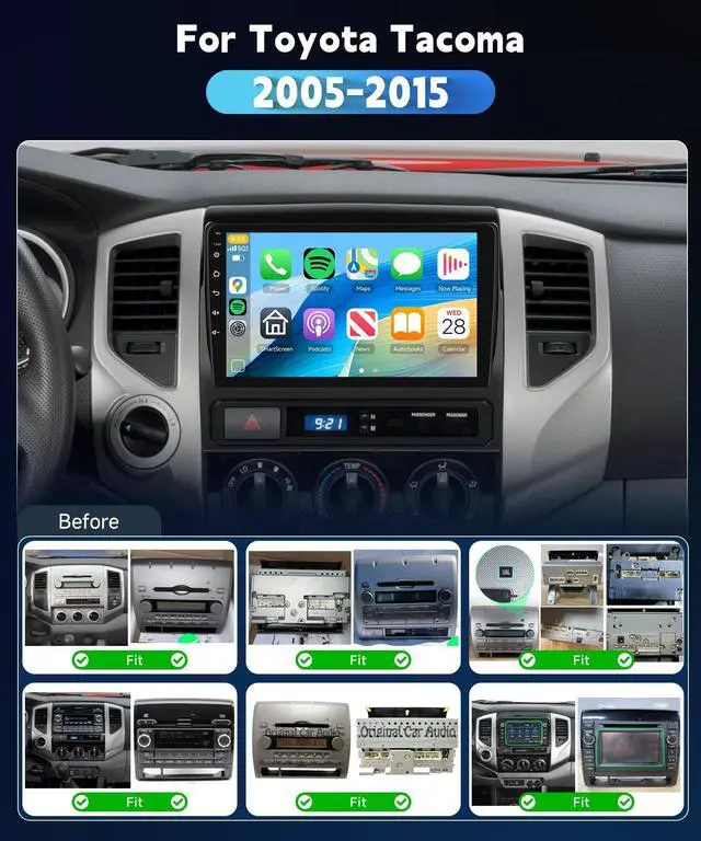 Wireless CarPlay & Android AutoEnjoy hands-free calls, navigation, music and messaging with wireless CarPlay and Android Auto. Auto-connect when you start the carno USB cable needed. ^^ Custom Fit for Chevrolet Camaro 20082015Designed specifically for Toyota Tacoma 2005-2015, this head unit fits perfectly and supports factory steering wheel controls for safer driving. ^^ Large 9 HD Touchscreen ExperienceThe 9-inch high-resolution touchscreen delivers clear visuals and responsive control for navigation, apps, and media playback, making every drive more enjoyable. ^^ Bluetooth & DSP Audio EnhancementBuilt-in Bluetooth ensures stable hands-free calls and music streaming.