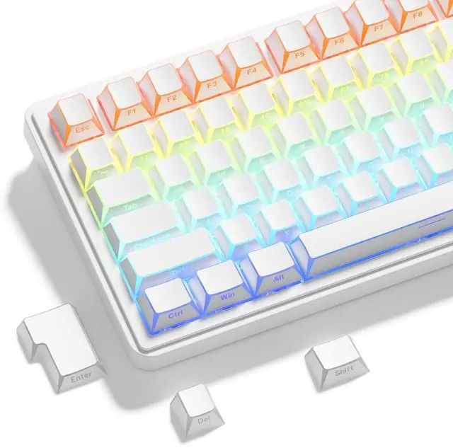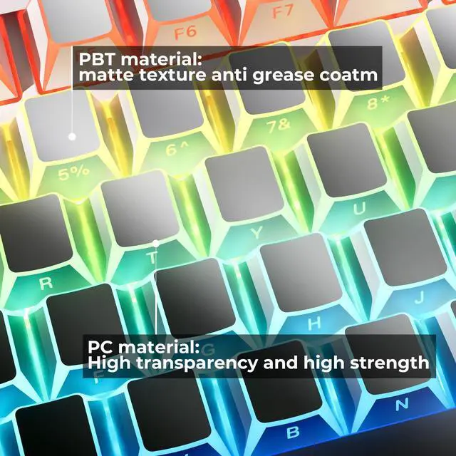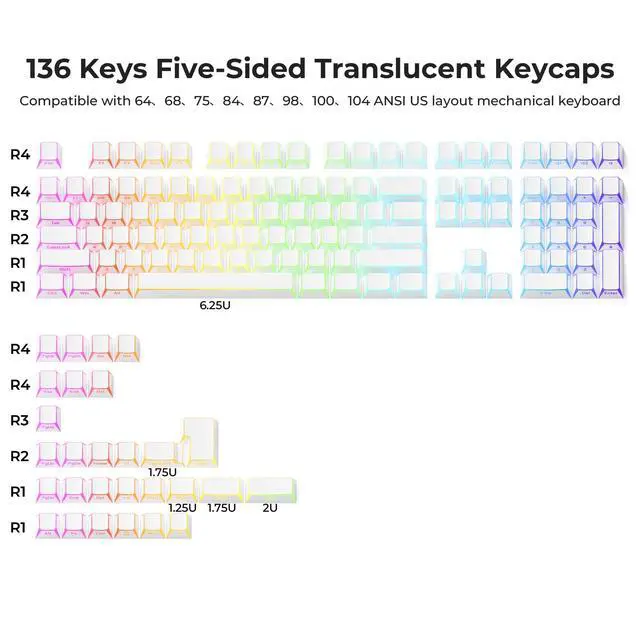 (Note: The side print keycap is more suitable for keyboards with LED facing south. ) ^^ Side-printed Shine Through KeycapsThe side printed design is making for giving your keyboard an incredibly sleek and clean feel. This backlit keycaps set also features side printed shine through fonts, and the fonts is widened and bold. the fonts or symbols on the sides of the keycaps are more visible in low-light conditions or from an angle, making it easier to see and locate the keys. ^^ Premium PBT KeycapsCrafted from high-quality PBT material, these keycaps offer exceptional durability and resistance to wear, friction, solvents. PBT, or polybutylene terephthalate, is a type of plastic that is known for its strength, rigidity, and resistance to heat and chemicals. ensuring that your keycaps retain their look and feel for years to come. ^^ Widely CompatibilityIncludes a full 104-key set and 32 additional keycaps, supporting a wide range of popular ANSI US and ISO UK layouts such as 40%, 60%, 65%, 75%, TKL, 96%, and full-size mechaical keyboard. ^^ Classic Cherry Profile KeycapsThe key cap designed with the classic Cherry profile, engineered for the ultimate typing experience.