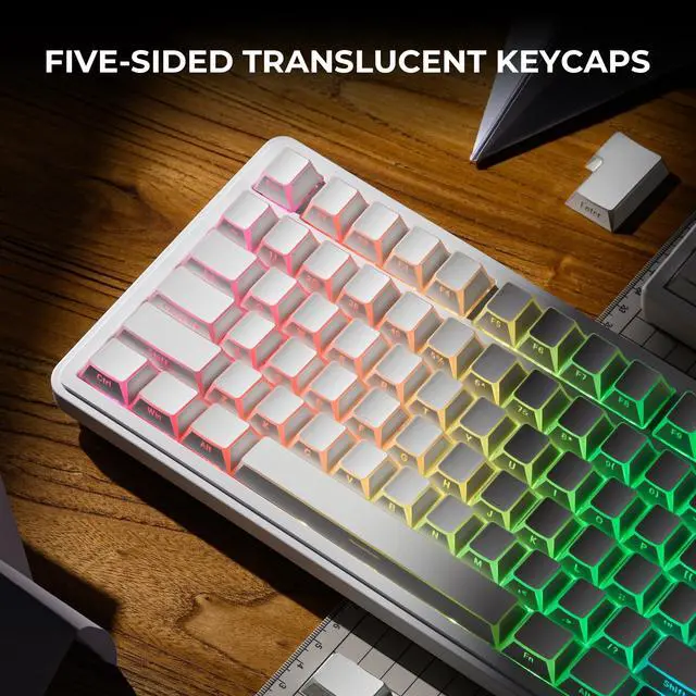 Five Surface Translucent KeycapsThe side-printed legends and five surfaces connecting remain transparent, This keycaps is designed to be slight light-transmissive on five sides based on the original side-printed shine through keycaps, offering a soft, eye-friendly backlight effect that is vivid yet never overly glaring. ^^ Double Shot KeycapsThese are doubleshot keyboard keycap set so the legends on the keycap will never wear out and the legends on the south of the keycaps can be illuminated due to the transparent PC material used in its inner layer, give your backlit keyboard a better RGB effect.