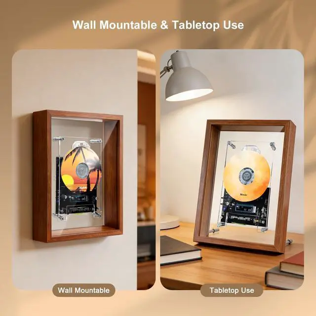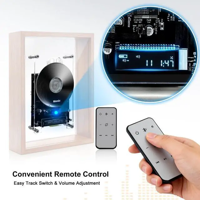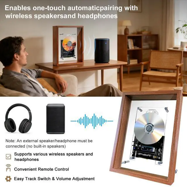 Retro dual-function design, with a wooden artistic stylePhoto frame + retro CD player. It is both a music device and decorative art, suitable for various home styles. It can be placed on the desktop or hung on the wall. The natural wood grain veneer is combined with a visual circuit window, integrating modern industrial aesthetics. ^^ Wireless expansion and convenient remote controlSupports various wireless speakers and headphones on the market. You can play CDs wirelessly. No complex settings required. Enjoy your favorite music right away. With the wireless remote control, easily switch tracks, adjust volume, and enjoy free control.