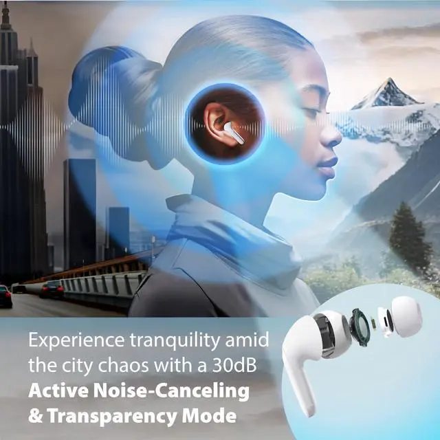 Coby Active Noise Cancelling Wireless Earbuds Charging Case Included, 30db Noise Canceling, IPX7 Waterproof, Transparency Mode, Smart App with Location Tracking, Customizable EQ (White)