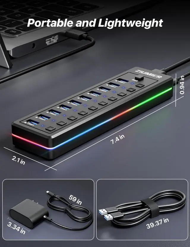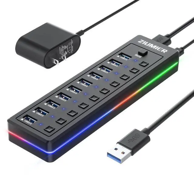 This lets you selectively turn off peripherals to save power, all with the simple press. ^^ [Powered by a High-Capacity 24W Adapter] Engineered for stability and reliability, the hub's 12V/2A power supply ensures safe for all your devices. It incorporates intelligent energy saving and full protection against overvoltage, overcurrent, and short circuits. ^^ [Wide Compatibility] ZIUMIER Powered USB hub is engineered to work effortlessly with Windows (XP to 11), Mac OS, and Linux. It supports all USB peripherals from 1.0 to 3.0 and requires no drivers, offering true plug-and-play convenience and hot-swapping capability.