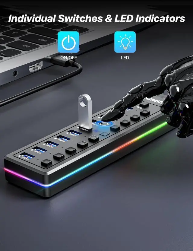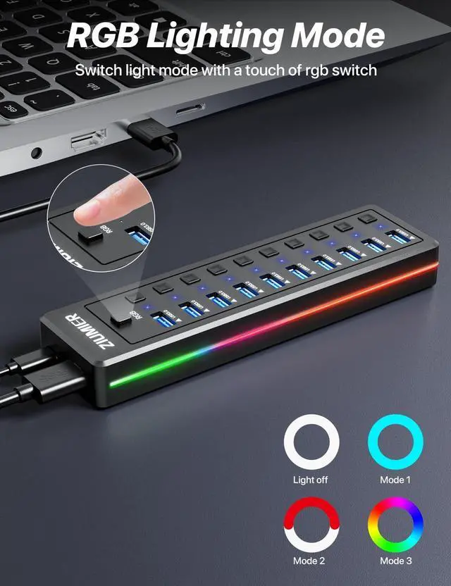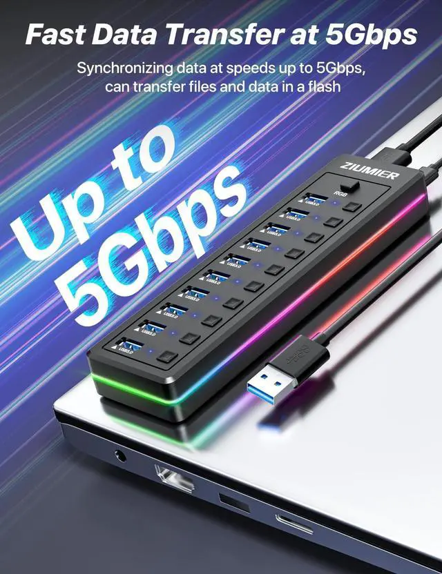 [RGB Lighting Modes] With the simple press of the RGB button, you can cycle through the Three RGB lighting modes. This powered USB hub transforms your desk setup, say goodbye to messes, bringing an immersive new experience to both gaming and work. ^^ [Experience 5Gbps Hyper-Speed Transmission] Unlock the full potential of our 10-port USB 3.0 hub. Effortlessly sync data and transfer massive files instantly at speeds ten times faster than USB 2.0, streamlining your workflow and eliminating waiting time. ^^ [Partition Independent Switch Control] Each USB port features its own button with an LED indicator, allowing you to easily see and manage device status.