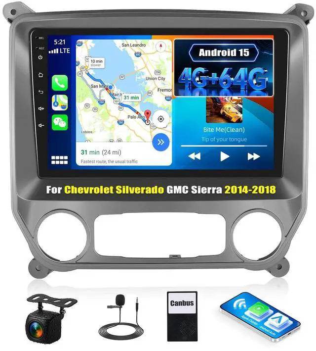 Compatible Car Models+ Powerful Android 15 System 4G+64G This android 15 car stereo fits for Chevrolet Silverado GMC Sierra 2014-2018. For Chevrolet Silverado GMC Sierra 2014 carplay car radio with powerful android 15 system, and upgraded memory of 4GB RAM+64GB ROM, you can enjoy a smooth and responsive user experience. Thousands of apps you want can be downloaded from music to games, faster than you can imagine. AHD backup camera and microphone are included ^^ Wireless Carplay & Android Auto & Mirror LinkElevate your driving experience with this head units wireless CarPlay, Android Auto, Mirror Link and Android 15 system.