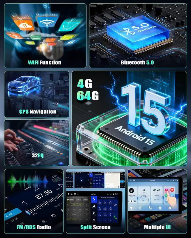 Powered by Android 15 for smooth performance, wirelessly connect your iPhone/Android to it or mirror screens via USB/WiFi. Control calls, music, navigation and apps with voice or touch, realizing seamless connection between phone and car stereo ^^ Built-in Bluetooth 5.0 & 32 EQ & FM/RDS RadioHead unit with bluetooth 5.0 and 32 EQ for the Chevrolet Silverado GMC Sierra 2014-2018, allows you to answer/make calls and be hands-free without distractions. Double din android head unit for Chevrolet Silverado GMC Sierra 2014 allows you to enjoy a superior music listening experience! Car video player for Chevrolet Silverado GMC Sierra also built-in FM/RDS radio, supports clear video & stable radio signals on your drives ^^ WIFI & GPS NavigationThis car stereo for Chevy Silverado GMC Sierra 2014-2018 is equipped with built-in Bluetooth 5.0, WiFi and GPS Navigation.