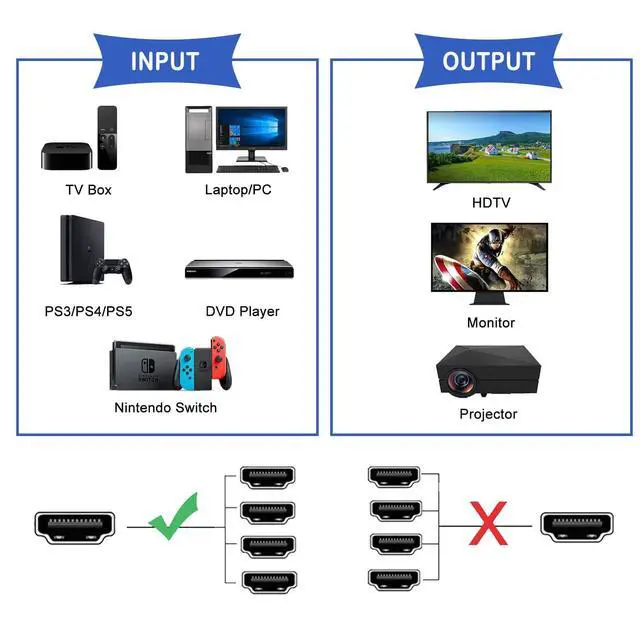 This is 1x4 HDMI 2.1 splitter distributes, For 1 HDMI source to 4 HDMI signal. It is not HDMI Switch that 3 HDMI Source to 1 HDMI signal. This HDMI Splitter Support 8K@60Hz, 4K@120Hz, 1080P@240Hz, Four HDMI outputs signal can display the same or different resolutions by EDID setting.
