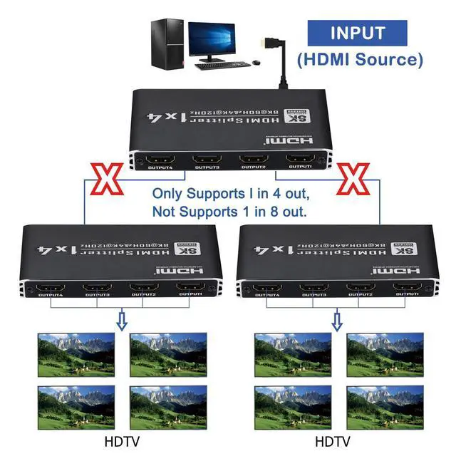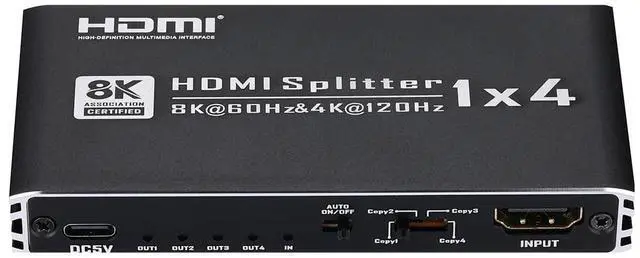 What You Get: 8K HDMI 2.1 Splitter (1 in 4 out) x1, DC 5V Power Adapter x 1, USB-C Power Cable x1, User Manual x1