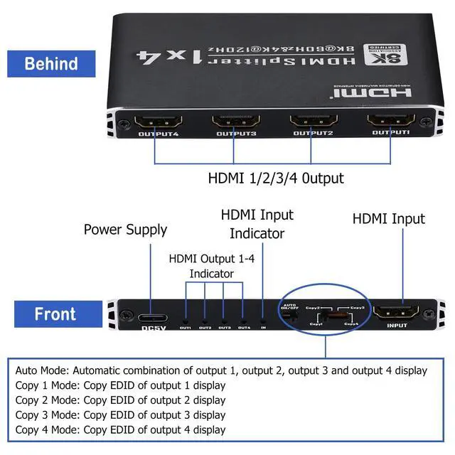 Supports Audio: Supported DTS-HD, Dolby-trueHD, DTS, Dolby-AC3, DSD etc ^^ Smart EDID managementEDID HDMI Splitter provides 4 switching modes( Auto mode and Copy 1, Copy 2, Copy 3 mode and Copy 4 mode) that can be met for different resolution needs. With flexible EDID switching you can set the desired output signal for your video sources to improve compatibility with your display or projector and works stability ^^ Wide Device Compatibility This HDMI splitter is easy to setup and operate. Just connect your HDMI devices and the USB power supply cable to enjoy. It is suitable for most devices with standard HDMI interface, compatible with PS3, PS4, STB, IPTV, BLUE-ray player, Xbox 360, Laptop and HDTV/HD Monitor etc ^^