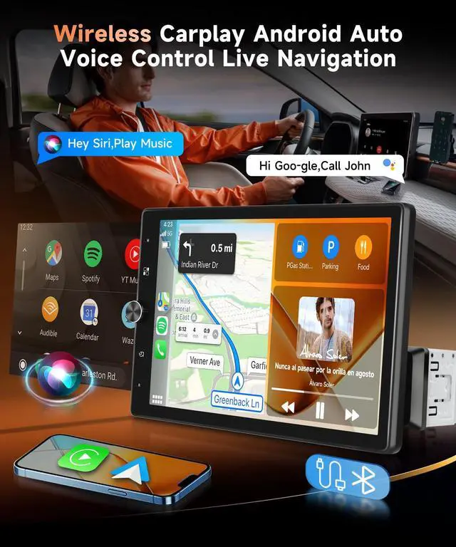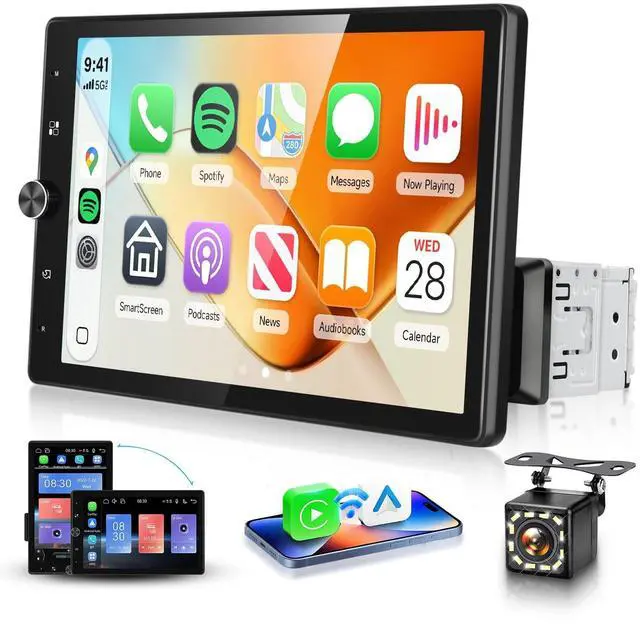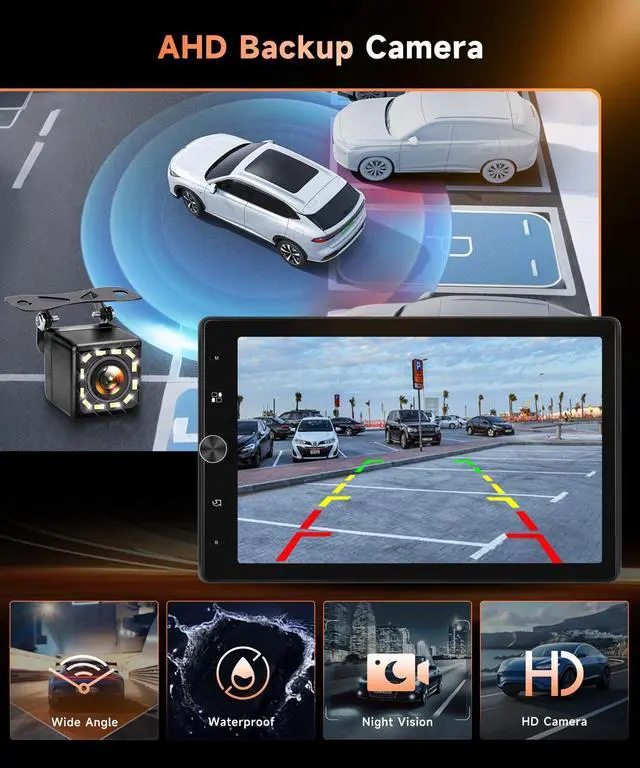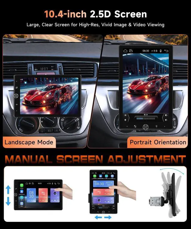 10.4 '' 2.5D Screen with Manual Rotation This MAHVEC single din touchscreen radio features a large, clear 2.5D display with high resolution and vivid colors, perfect for viewing photos and videos. Supports manual screen rotation to switch between vertical and horizontal modes, letting you access different content more flexibly and conveniently while on the road ^^ Wireless/Wired CarPlay & Android Auto This single din radio supports both wired and wireless connections to CarPlay and Android Auto. Pair your phone via Bluetooth to seamlessly make/receive calls, access contacts, email notifications, navigation, music, videos, and achieve voice control ^^ Backup Camera & Steering Wheel Control This car stereo supports CVBS/AHD 720P auto-switching, delivering a clear wide-angle rear view with auxiliary guide lines for safer, smarter reversing.