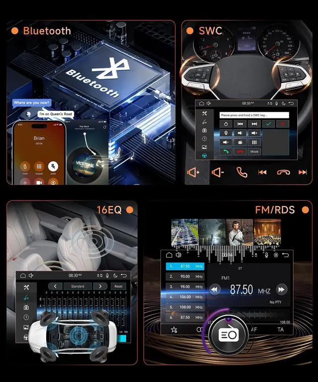 Equipped with SWC, this car radio lets you adjust volume, switch songs, and answer calls hands-free preserving driving habits while boosting safety ^^ Built-in Bluetooth & Screen Mirroring Support This single din car play radio has dual-channel Bluetooth for calls, contact sync, music playback, and voice control. Support screen mirroringcast your phones display to the car stereo, access apps/games, and control your phone via its touchscreen. ^^ FM/RDS Radio & EQ Adjuster Built-in FM/RDS radio lets you tune into real-time traffic, news, weather forecasts, and more, with 18 preset stations for quick access.