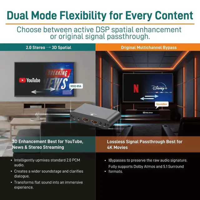 MSQ-85A DSP HDMI Virtual Surround Audio Enhancer is designed to elevate TV and home entertainment audio without the complexity or cost of traditional surround sound systems. By leveraging advanced DSP audio processing, the MSQ-85A intelligently enhances spatial depth, balances volume dynamics, and improves dialogue presence for a more immersive and comfortable listening experience. Supporting HDMI ARC connectivity, the MSQ-85A integrates seamlessly with modern TVs, soundbars, and speaker systems while maintaining compatibility with multichannel audio formats through passthrough. Its compact, plug-and-play design makes it ideal for living rooms, apartments, and space-conscious setups, delivering enhanced surround perception without additional speakers or complicated configuration.