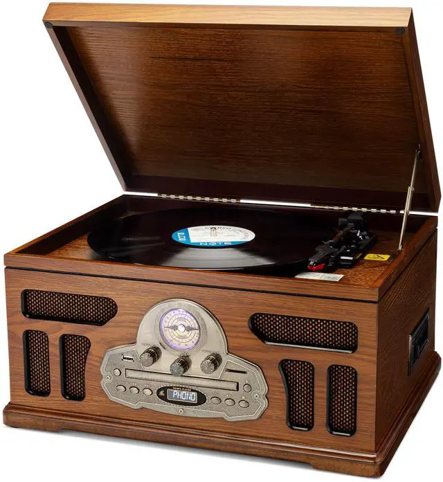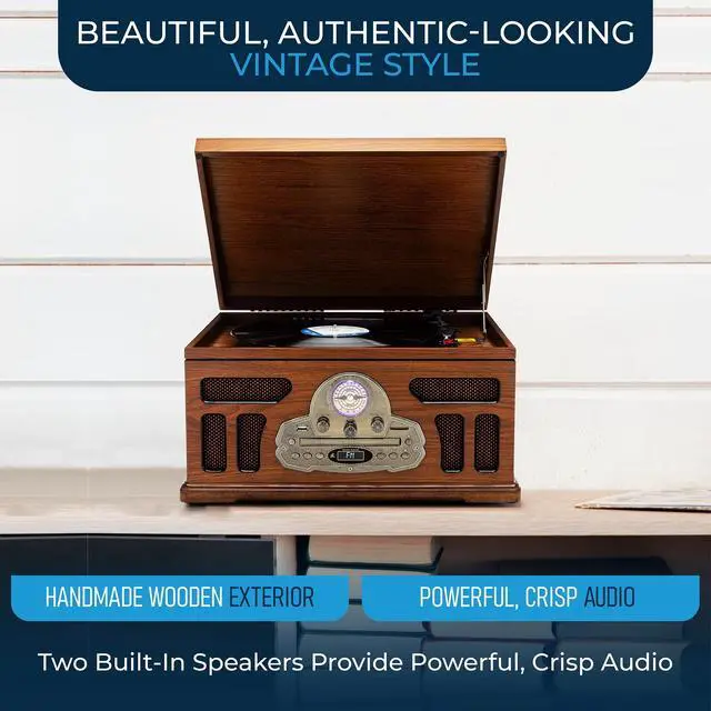Turntable: Record Player (33/45/78 RPM), Bluetooth, CD Player, Cassette Tape Player, AM/FM Radio, USB Playback, USB Recording to Digital Audio File (USB Flash Drive Not Included) ^^ Beautiful, Authentic Vintage Look with a Handmade, Real Wooden Exterior (Product