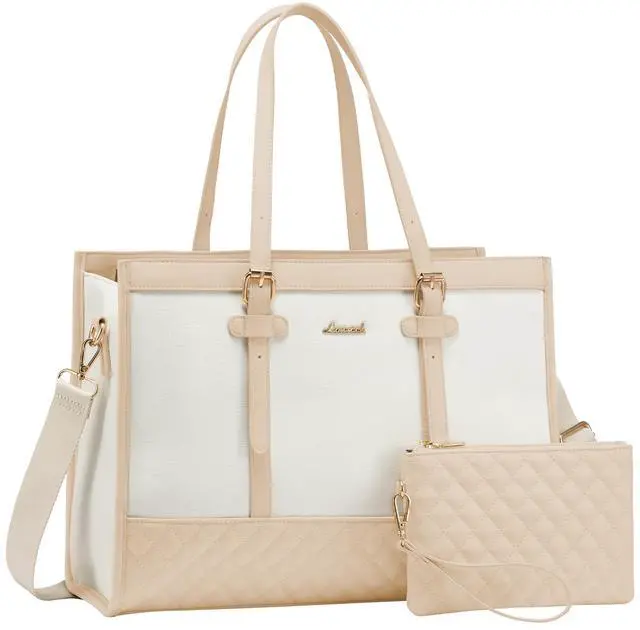LARGE CAPACITY & LAPTOP COMPARTMENT Size of womens laptop bag: 16.1" * 6.3" * 12.2". The dedicated laptop compartment provides maximum protection for your device. 2 inner pockets, 2 slip pockets, and 1 zipper pocket for small items such as a phone, wallet, makeup, passport, etc. ^^ COMFORTABLE AND CONVENIENT CARRYING The tote bag is designed with your comfort in mind. Detachable & reinforced stitching shoulder strap for durability, you can carry it as a crossbody bag, freeing your hands. Plus, the leather handle can adjust the length to fit different heights. ^^ COMPLIMENTARY CLUTCH BAG The clutch purse is compact enough to fit in your hand or easily slip into a larger bag, yet spacious enough to hold all your essentials, such as your phone, keys, cards, and makeup. ^^ VERSATILE AND PRACTICAL Built-in key hooks are perfect for keys or other accessories. The back pocket provides convenient storage space for your phone, wallet, and other small items! A side pocket in the bag is used to hold a water bottle or umbrella. The metal bottom nail makes our work shoulder bag wear and stain-proof.