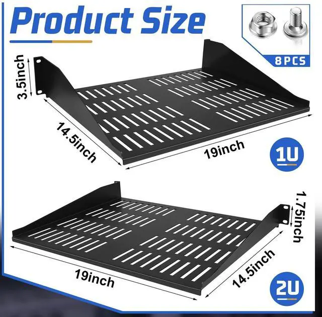 rack shelf: about 19 x 14.5 x 1.7 inches/ 48.2 x 37 x 4.4 cm2U rack shelf: about 19 x 14.5 x 3.5 inches/ 48.2 x 37 x 8.8 cmPackage includes: 1 Piece of 1U rack shelf1 Piece of 2U rack shelf8