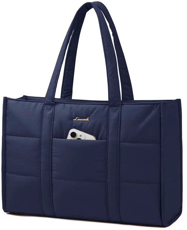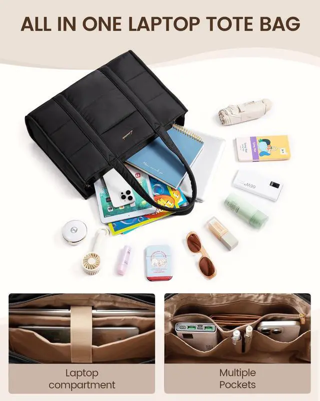 The cute tote bag's wide opening ensures you can quickly pick up your belongings ^^ Suitable Size for Everyday LifeMeasuring 15.8" L x 5.7" W x 11.8" H, this puffy laptop tote holds your daily essentials, including 15.6" laptop, 12.9" iPad, makeup, phone, glasses, charger, tissues, water bottle ^^ As a Thoughtful GiftThe women's tote bag is versatile, fitting various occasions and pairing well with different styles of outfits. It is a wonderful gift option for family and friends, and a lovely choice for women.