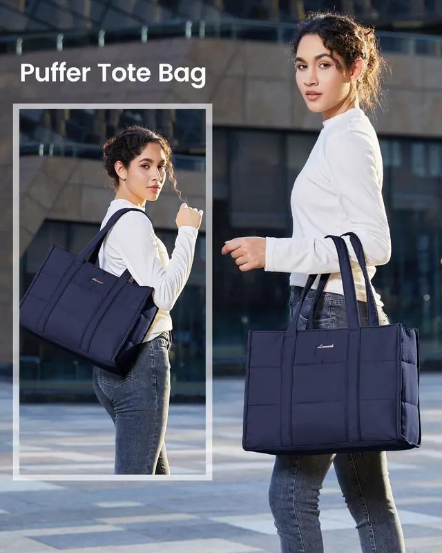 • Suitable Size for Everyday LifeMeasuring 15.8" L x 5.7" W x 11.8" H, this puffy laptop tote holds your daily essentials, including 15.6" laptop, 12.9" iPad, makeup, phone, glasses, charger, tissues, water bottle