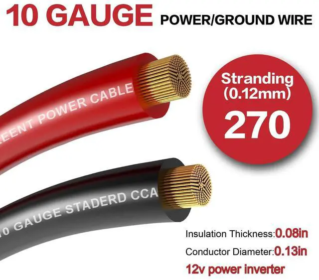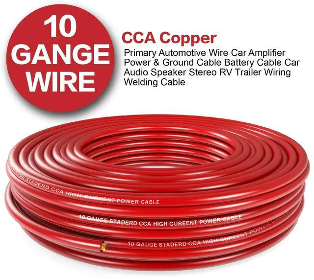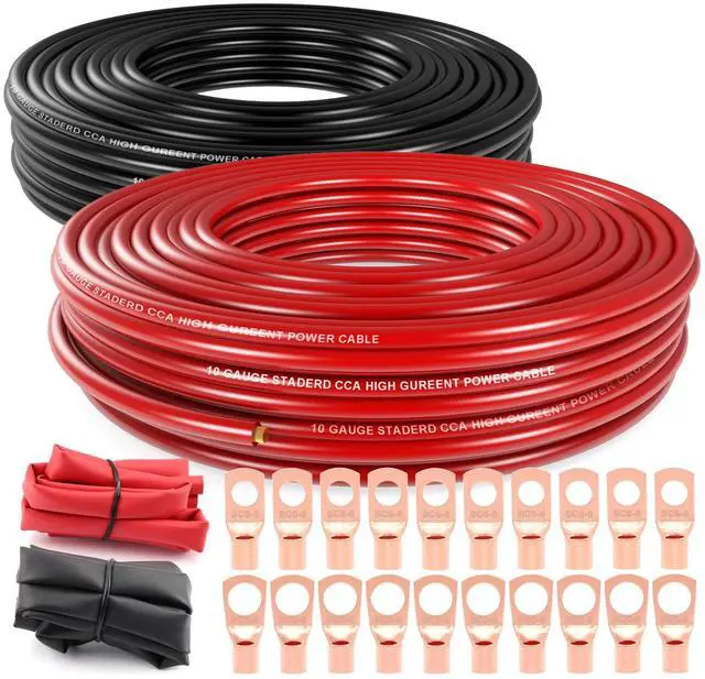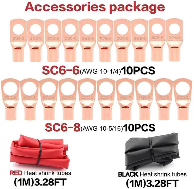 Package Including: 1 pcs 10 gauge black CCA power ground wire (100 feet); 1 pcs 10 gauge red CCA power ground wire (100 feet); 10pcs SC6-6" Battery Lugs; 10pcs SC6-8" Battery Lugs; 6FT 3:1 Dual Wall Adhesive Heat Shrink Tubing.