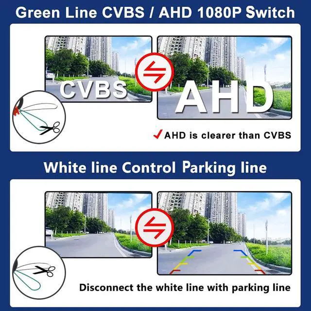 DUAL CONTROL CABLE: Supports AHD 1080P and CVBS video signals. Its output video signal defaults to CVBS. If you need to connect an AHD monitor, please cut off the white cable on the camera and reconnect the power supply. The guidance can be adjusted on or off, and when you get it, it defaults to having a reference line. If you do not need a guide wire, please cut off the green circuit and reconnect the power supply ^^