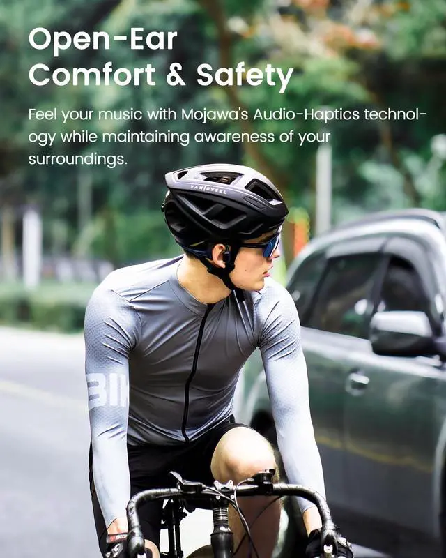 Open Ear Bone Conduction Headphones: HaptiFit Terra features Open-Ear design for safety and comfort and Mojawa's Audio-Haptics technology for bud-free listening experience. It delivers an electrifying 4D workout soundtrack, and presents four unique sound effects, effortlessly adaptable to any scenarios ^^ Bluetooth and 32GB