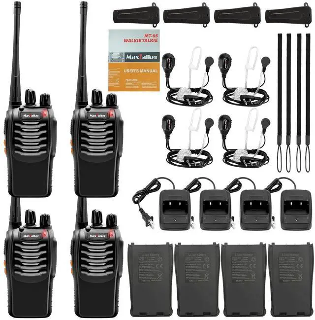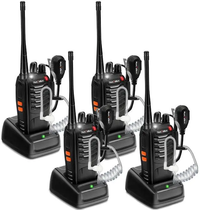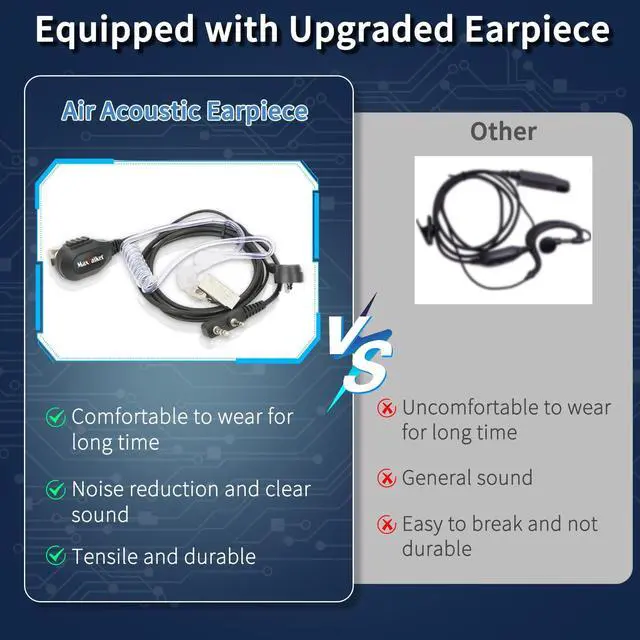 Upgraded Earpiece And Clear Sound: MaxTalker walkie talkies rechargeable come with upgraded headset which design with Air Acoustic Tube and silicone in-ear earbuds to ensure that your calls are crystal clear in noisy environments and more comfortable to wear, ehich compared with the common walkie talkies with earpiece and mic set, you won't feel uncomfortable even if you have weared it for a long time, and deliver clearer sound quality, while protecting your privacy.