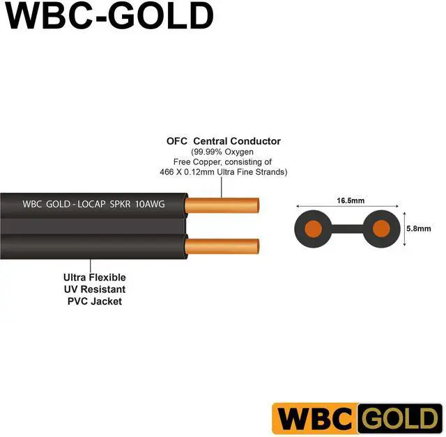 WBC-GOLD Cable Range is introduced as a must for the discerning individual beginning his journey as an Audiophile. A perfect marriage between Audiophile Quality and Affordability, the WBC-GOLD cables are the ideal stepping-stone into the world of high-quality audio experiences without breaking your bank. Coming directly from our factory, which allows us to offer jaw-dropping price levels, the cables boast the Legendary WBC Performance and Assembly Quality that is Built to Last a Lifetime! ^^ The WBC-GOLD-LOCAP-SPKR-10AWG consists of a total of 932, 99.99 % Highly-Pure Oxygen Free Copper (OFC), 0.12 mm fine strands divided equally between two 10AWG cores laid out in an expanded dumbbell speaker cable design.