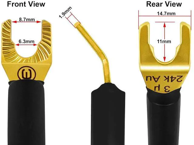 The additional distance between the 2 cores ensures probably the worlds lowest capacitance and the lowest inductance for a speaker cable in the sub $200 price range. These conductors are then covered by a proprietary PVC-blend for tough yet highly flexible outer jacket. ^^ At WBC we only use the highest-grade connectors for these audiophile cable assemblies. Eminence 3 micron, 24K Gold plated, audiophile-grade, multi-spade connectors, (compatible with 8mm and 6mm binding posts), provide superior abrasion & corrosion resistance and unrivaled performance. The spade plugs are specially reinforced to support heavy gauge cables (thicker profile).