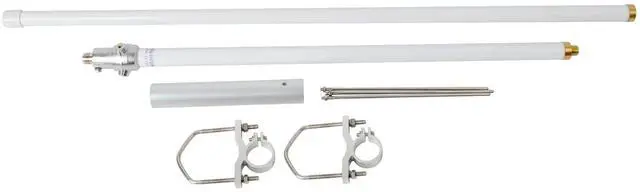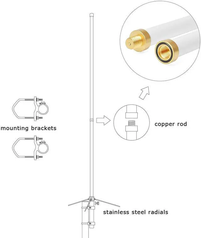 Pole Diameter: 1.182. 4 inches ^^ The antenna is made up of 2 sections of white fiberglass, and is connected by copper rod to reduce power loss and make the antenna have better reception and transmission. ^^ The antenna is pre-tuned, no tuning needed. Heavy-duty fiberglass construction greatly improves the outdoor working life of the antenna. ^^ Includes mounting brackets, hardware and stainless steel radials. Coax cable sold separately. If you have any questions about antenna installation, please feel free to contact the seller Trust communication.