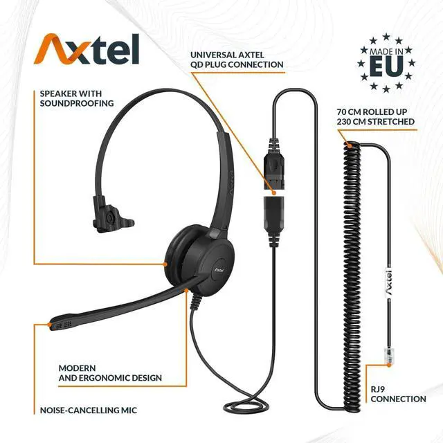 Single Ear (Monaraul) Professional Headset designed for all the companies that value effective communication. The Axtel PRIME HD headset uses Acoustic Protection technology for HD quality sound and excellent noise- cancellation in any given environment. We know how loud open-space offices can be, so we designed a headset that delivers a completely new level of business communication. ^^ Compatible with Avaya 2402, 2410, 2420, 4602, 4602SW, 4610SW, 4620, 4620SW, 4621SW, 4625SW models ^^ Compatible with Mitel 6863i, 6865i, 6867i, 6869i IP Phones ^^ Compatible with Polycom VVX 101, VVX 150, VVX 201, VVX 250, VVX 300, VVX 301, VVX 310, VVX 311, VVX 350, VVX 400, VVX 401, VVX 410, VVX 411, VVX 450, VVX 500, VVX 501, VVX 600, VVX 601 ^^ Bundle includes Axtel Prime HD Professional Headset and AXC-01 Quick Disconnect Cable.
