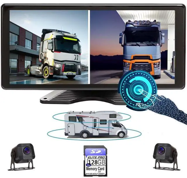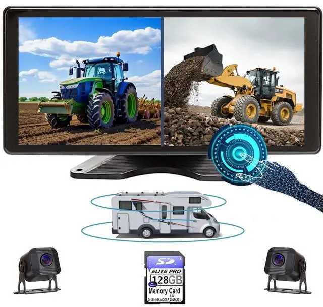 Monitor: Wide 10.36 inch Screen, so we can observe 100% road situation. Larger screen, safer driving. 2 split screen, 2 channels, 2 different angles help us to get a 360 degree view. For rear, parking, front, side, left, right, hitch, turn signal view. We also can choose the monitor to display 1/2 cameras' image. We can drive confiedntly. ^^ Good for large vehicles, such as buses, box trucks, pickup trucks, garbage trucks, flatbed trucks, dump trucks, street sweeper trucks, refrigerator trucks, motor homes, vans, skid steers, farm tractors, combines, cotton pickers, crop sprayers, bulldozers, snow plows, forklifts, excavators, heavy equipments, etc. ^^ Built-in DVR Record Video Audio Included.