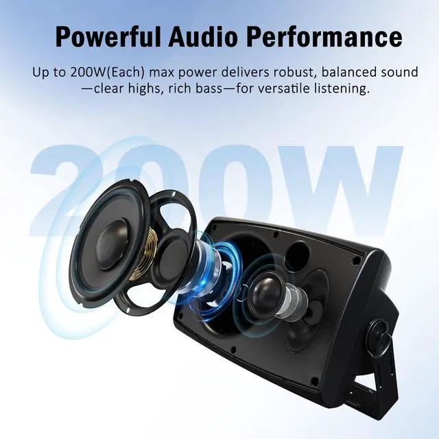 Bluetooth 5.3T his waterproof Bluetooth outdoor speakers (active + passive) features an integrated Bluetooth amplifier, utilizing Bluetooth 5.3 technology that delivers crisp sound quality from your backyard patio with a line-of-sight range up to 65 feet. It pairs seamlessly with a variety of the latest devices including iPhones, Android smartphones, iPads, tablets, personal computers, and more, providing a user-friendly pairing experience. ^^ Equipped with TWS and Reset ButtonsThis wired outdoor Bluetooth speaker features a TWS (True Wireless Stereo) pairing button and a Reset button conveniently located on the back of the master unit.