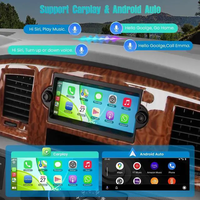 Applicable Car Models 6.8" Android 14 4+128 car radio for Dodge Ram 1500/2500/3500 (2006-2008), Dodge Durango (2005-2008), Jeep Grand Cherokee (2005-2009) ^^ Wired/Wireless CarPlay & Android AutoAndroid car stereo for Dodge Ram support wired/wireless Apple CarPlay and Android Auto, With wired connection or wireless connection through Bluetooth, you could more easily access the apps of your phone. You can also able to wake up the voice assistant Siri or Google Assistant to operate Apps on your phone, easily use GPS navigation, calls, message, music, and much more functions while keeping your hands free for safe driving.