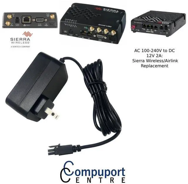 The SIERRA WIRELESS AC-12V DC adapter is compatible with the RV55, XR90, ES450, LX60, and LS300 models, converting 110 VAC to 12V DC power. It is also suitable for all Microhard modem models. ^^ CompuPort provides a replacement wall power supply that is compatible with all models of the Cradlepoint/Ericsson IBR900, IBR950, IBR650, IBR350, and IBR600, originally designated as part numbers 170584-001 and 170716-000. ^^ Replacement AC Power Supply for Peplink Max BR1 Pro. ^^ This power supply is compatible with the RedLion (Sixnet) SN-6700 series and the inHand VG710, but it is NOT suitable for Teltonika devices.