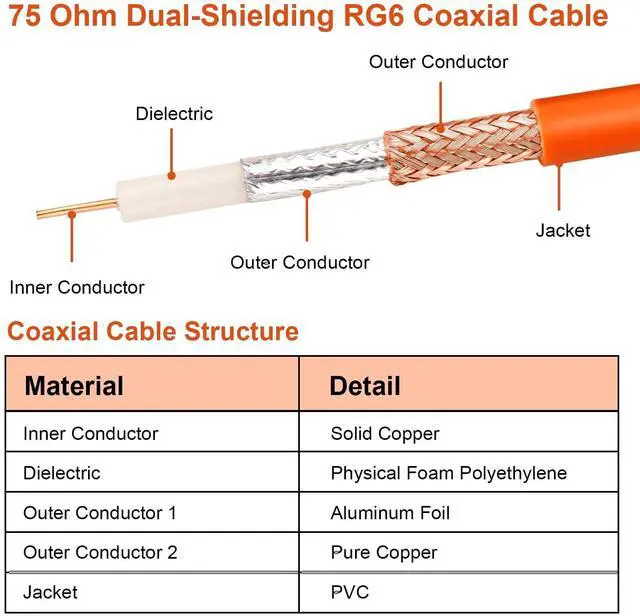 HIGH FREQUENCY RANGE - MOOKEERF rg6 cable is 100% pure copper core for high frequency use, which has been sweep tested up to 6GHz. ^^ DUAL-SHIELDING -- This rg6 coax cable use a 18 AWG center conductor, with exceptional dual-shielding - using 60% braid and 100% foil for maximum signal performance. It is great for long runs and can deliver a clear signal. ^^ DUARABLE&FLEXIBLE -- The jacket is made of flexible PVC which ensures long-lasting protection against water, wear, tear, and environmental factors. ^^ WIDE APPLICATIONS - Suitable for broadcast, satellite, cellular, and CCTV installations, our 75ohm rg6 coaxial cable delivers exceptional signal quality and reliable performance.