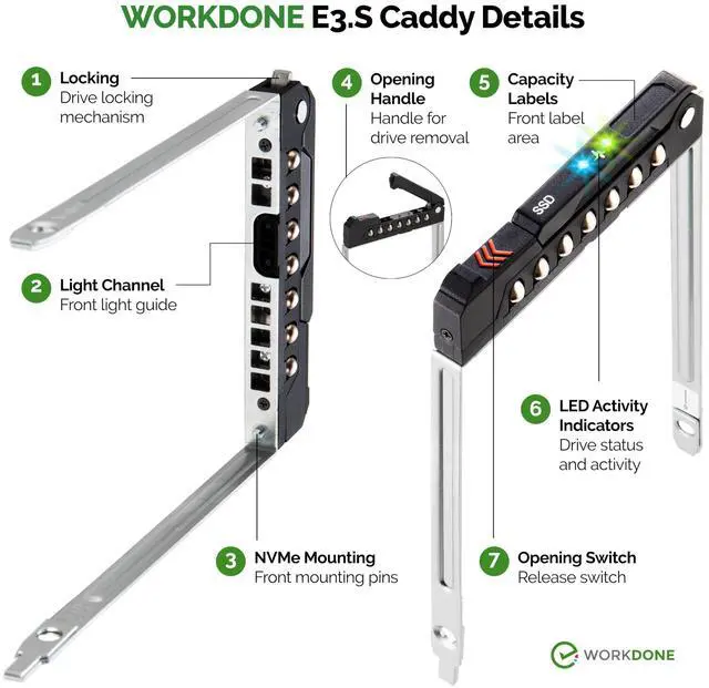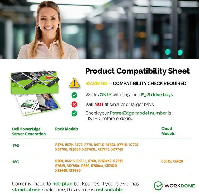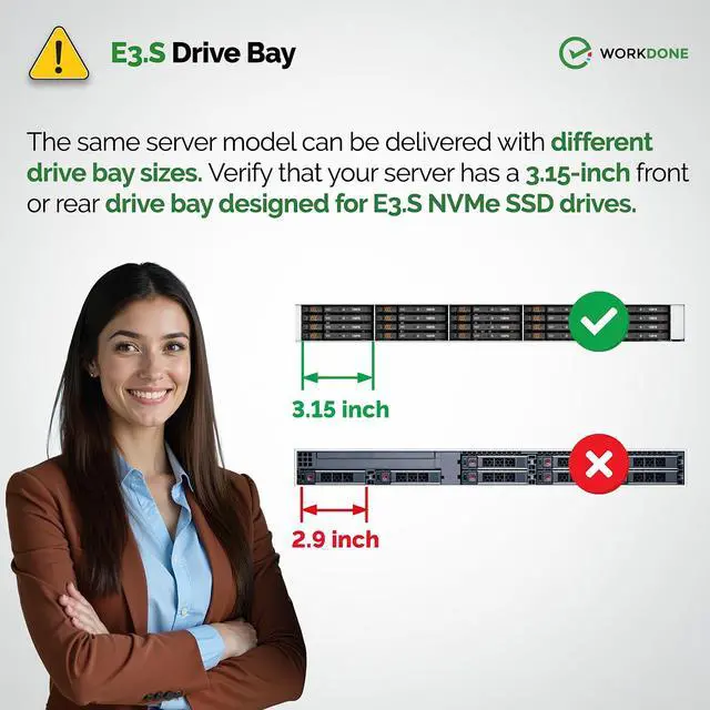 ^^ READY TO INSTALL: WORKDONE drive trays include all required screws and mounting hardware for quick installation. Designed for 17th-16th Generation servers, made from durable materials, individually inspected, and securely packed for safe delivery. Non-OEM replacement part compatible with NV2RX / 0NV2RX. Supports ONLY 3.15" E3. S Hot-Plug drive bays; NOT compatible with 2.9" or 3.5" bays.