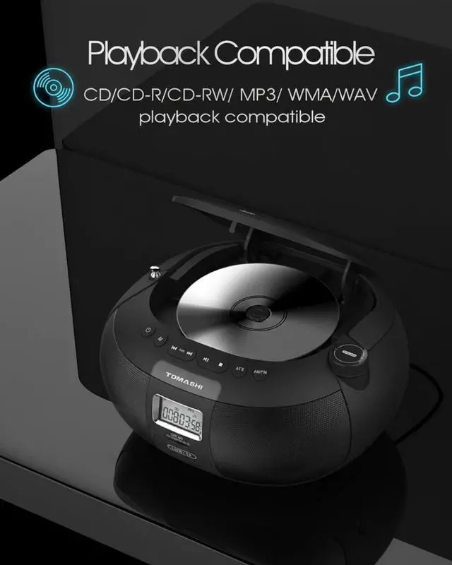 All-in-One CD Compatibility & Skip-Free PlaybackThis portable CD player boombox supports CD, CD-R, CD-RW, WMA & WAV formatsideal for your vintage CD collection or custom mixes. Built with a precision laser lens, it delivers uninterrupted, skip-free playback whether youre at home or on the go