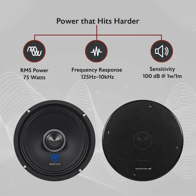 You are looking at the best value on the market today for high quality mid style speakers. The Rockville RXM68 is a 6.5" midrange/midbass driver that features 150 watts peak power handling and 75 watts RMS per speaker. These speakers are CEA compliant which means they are tested and rated by the industry standard. They are rated the same way that other premium brands such as Kicker, Rockford, and JBL rate their speakers. So you can feel confident when comparing these with other mids on the market or when matching these up with a high quality amplifier.