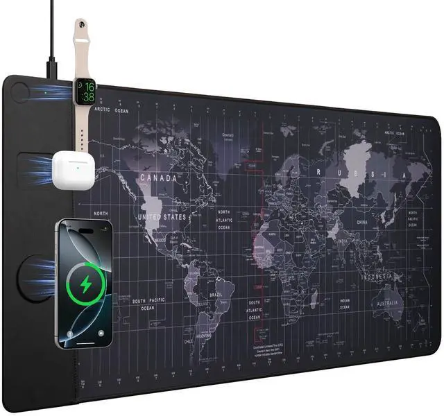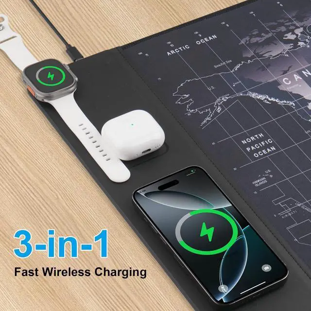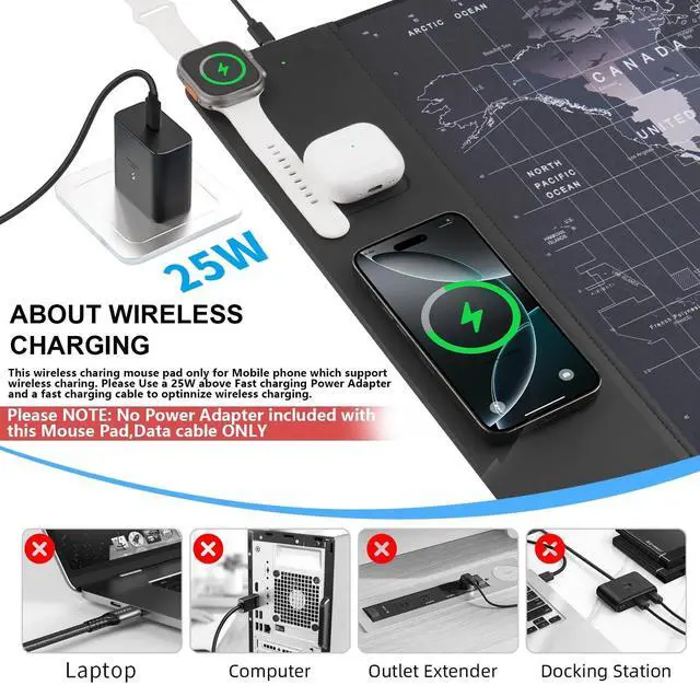 3-in-1 Wireless Charging Mouse Pad-Fast Charging Mouse Pad, offers 15W wireless charging for smartphones, 5W wireless charging for earphones, 2.5 w charging for smartwatches. It compatible with iPhone 16/15/14/13/12/11/X/8 series; Samsung Galaxy S23/S22/S21/S20/S10/S9/S8/Note 9/8; Airpods 4 with ANC/3/2/Airpods Pro 2nd/Airpods Pro and all other Qi-enabled devices. Whether you're at the office, home, or on thego, our Charging Pad ensures efficient and convenient charging for all your devices. ^^ Attention-This wireless charing mouse pad only for Mobile phone/Device which support wireless charing. Please Use a 25W above Fast charging Power Adapter and a fast charging cable to optinnize wireless charging.
