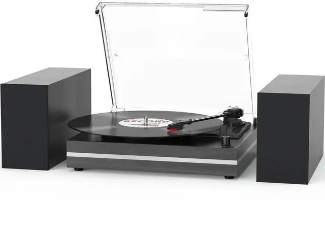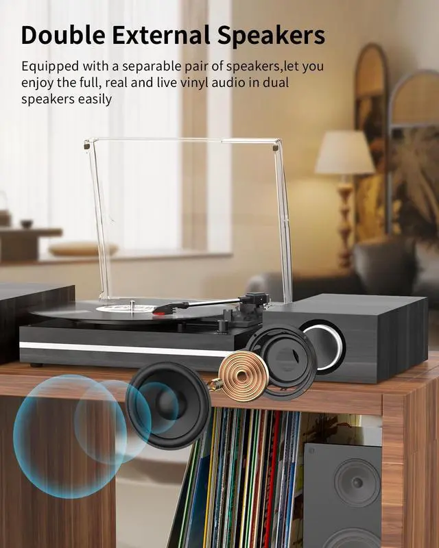 [All-in-one Suitable for Beginners] Simple setup and operation. Great ideal for a beginner. The AUX input port allow you to play mp3 music. Detachable hinged dust cover protects your record when not in use, and it would not affect the playback when you close it. A high-end vintage look, it will be a perfect choice for birthday and Christmas, especially for a music lover. Any questions, please email us, we always here ^^ [Two External Speakers] Equipped with a separable pair of speakers, let you enjoy the full, real and live vinyl audio in dual speakers easily.