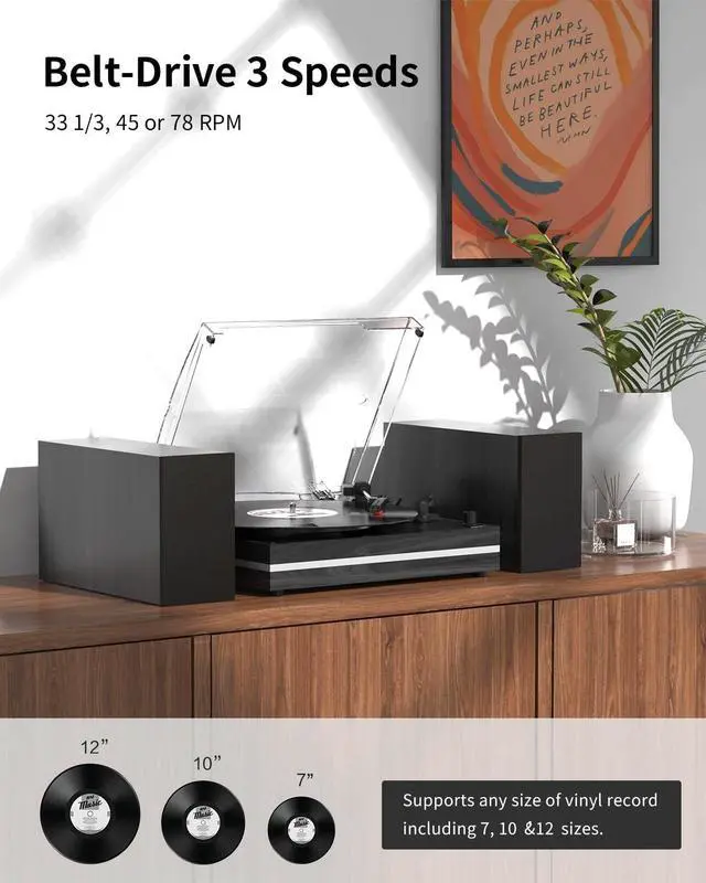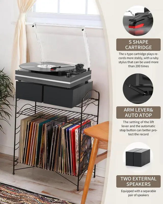 Auto-stop function setting makes it possible to stop automatically when it reaches the end of the record, better protect your records ^^ [Vintage Looking Style] Enjoy your favorite vinyl with this vintage-looking turntable. The minimalism, retro design of this record player makes for a stunning and functional turntable. Dual powered bookshelf speakers allows for multiple placement options, and can be placed as a bookshelf or record shelf. Youll notice our attention to detail through unique touches which more affordable models just cant match for