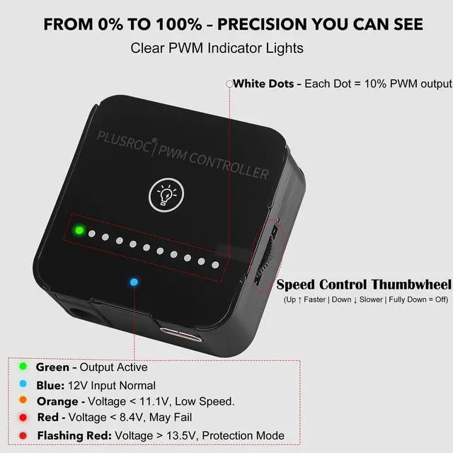All-in-One PWM Fan Controller Hub PlusRoc combines a 4-pin fan splitter and manual controller in one compact unit. Features 6 standard 4-pin JST headers, no need for a separate fan hub. Supports expansion if connecting more than 6 fans. ^^ Seamless Fan Speed Control Side-mounted dial delivers smooth 0100% manual adjustment with no PWM stepping. Easily balance cooling performance and noise for gaming PCs, workstations, or DIY builds. ^^ LED Power & Speed Indicators LED lights increase with fan speed for instant feedback. Blue = normal 12V input, orange = low voltage, red = critical (fans may stop).