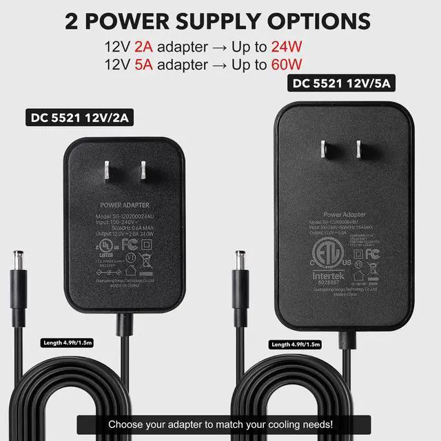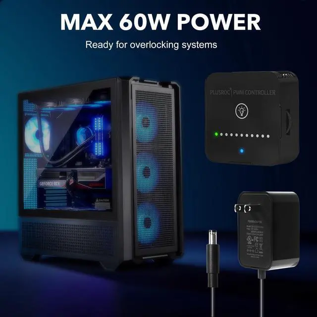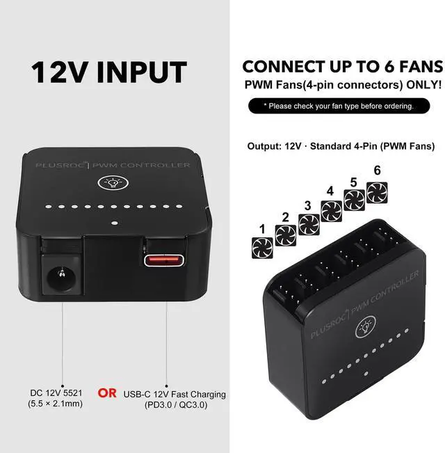 Press the center button to disable lights anytime. ^^ High Power Output, Simple Setup Supports 12V input via USB Type-C(fast-charge adapter required) or DC 5521. Provides up to 2A per port, 5A total, for a maximum of 60W. Do not power both inputs at once. ^^ Flexible Options for Any Build Available as fan controller-only, with 12V/2A adapter (24W), or 12V/5A adapter (full 60W). Choose the setup that matches your fan controller needsfrom compact PCs to heavy-duty cooling rigs.