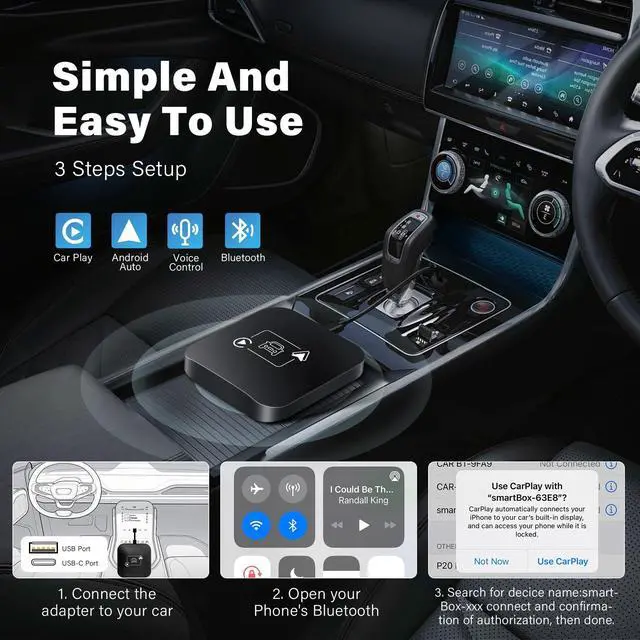 PS: If you encounter incompatibility with your phone, please ask customer service, thank you for your support! ^^ 2 In 1 CarplayThis adapter not only comes with a USB connector, but also a Type-C connector, the 2-in-1 function easily realizes all kinds of connections, so you can easily realize the connection operation without any trouble. Enjoy wireless and portable carplay with ease. ^^ Hands-free CallingWith this adapter that can realize wired Carplay to wireless Carplay, you can say goodbye to the clutter of various data cables in the car, expand the space in the car, and start a convenient trip. You can play music, use map navigation, Siri voice, Phone call, etc. at any time, fully functional and travel with peace of mind. ^^ Operation MethodAfter connecting this adapter, the operation method is also very convenient, you can operate it by rotating the knob in the car, clicking the button, touch screen control and voice control and other ways, which brings convenience and safety to your trip, and makes your journey no longer boring and full of fun.