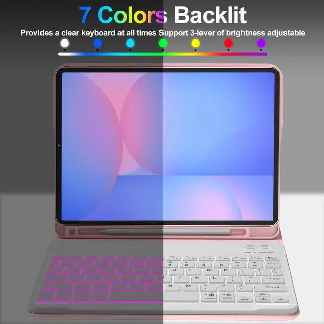 NOTE: this keyboard case is not fit for S9 FE+ 12.4", S10 FE+ 13.1". ^^ 7 Color Backlit Keyboard for Samsung Galaxy Tablet Enjoy customizable typing experiences with the stunning 7 color backlit Bluetooth keyboard, which not only enhances visibility in low light but also adds a touch of style to your tablet setup. Whether you're using it for work, creative projects, or personal use, this keyboard enhances both functionality and aesthetics, making it a valuable accessory for tablet users who seek both performance and style. ^^ Multi-angle view &Magnetic DetachableThis galaxy tab S10 FE case has multiple viewing angles, allowing you to use the tablet at a comfortable tilt angle and enjoy reading, typing, sketching, chatting, etc. Wireless keyboard can be attached to the case magnetically. The ultra-thin and lightweight keyboard is easy to attach and remove from the magnetic cover, simple and portable. Created to take your Galaxy Tab S10 FE/S10 Lite to the next level of everyday use. ^^ All-round Protection for Galaxy S10 Lite/S10 FE TabletOur samsung galaxy tab s10 book cover keyboard made of soft TPU and flexible TPU inner shell, which are drop-proof and scratch resistant, also not slippery or stick while carrying it around, greatly reduces the damage to your tablet caused by collisions.