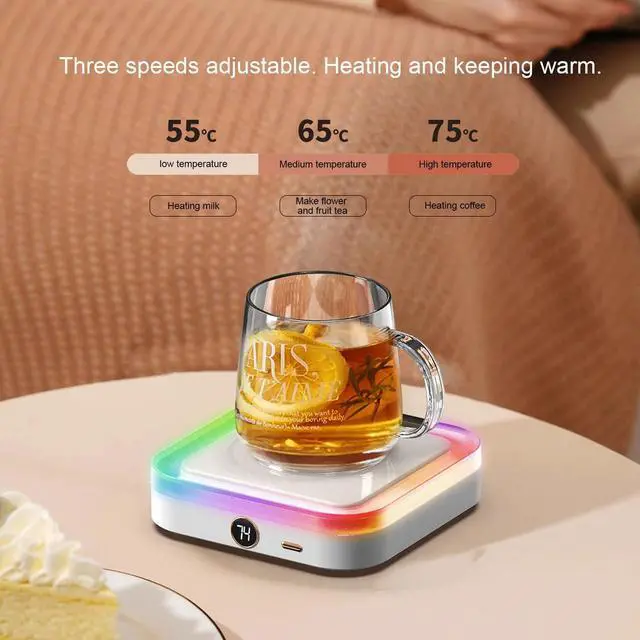 3 Temperature SettingsThis mug warmer will keep your coffee at a constant temperature. You can control the temperature with the click of a button to keep your coffee or milk between 55C, 65C, 75C. The temperature can be changed with the click of a button. The LED digital display show the temperatur. Changing temperature is just a tap on of your finger. ^^ Universal Fit for All CupsCup Warmer for Desk adopts the sealing and insulating technology, which can effectively prevent splashing and also fits most standard mugs. It is not picky about the type of cup, it can heat the mugs, glasses, cans, milk cartons, milk bottles.