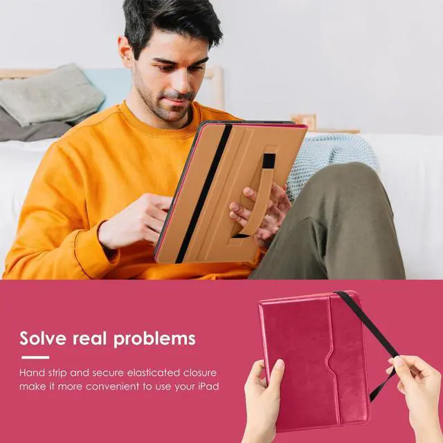 • [FASHION AND PROTECTION] - Offers the difference by full protection Design, leather back provides strong support, anti-fingerprint and anti-scratch. Soft TPU frame protects your iPad from shocks, drops and shocks. Hand strap helps you secure the front cover.