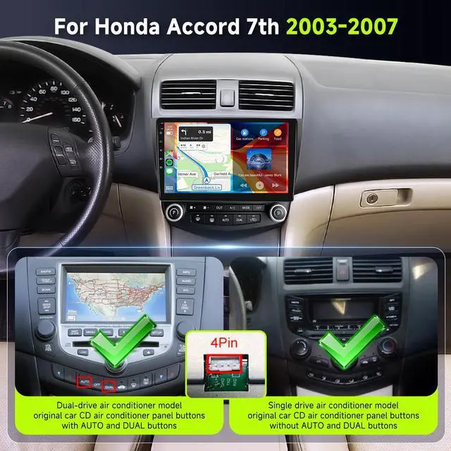 1. For Honda Accord Car Radio The 8Core Chip 6G+128G Android Car stereo fits for Honda Accord 7th 2003 2004 2005 2006 2007 radio. 8Core Upgraded Chip 6G +128G ensure run smoothly, Package contains frame accessories and installation tools. Before purshasing, please check your car models/years/shape of center console. If you have any question, please tell us via ^^ 2. Wired/Wireless CarPlay & Wireless Android Auto The car stereo supports both wired (USB) and wireless (Bluetooth) connections for CarPlay and Wireless Android Auto. Use apps like Waze, Spotify, YouTube Music, and Sirius-XM Radio on the touchscreen.