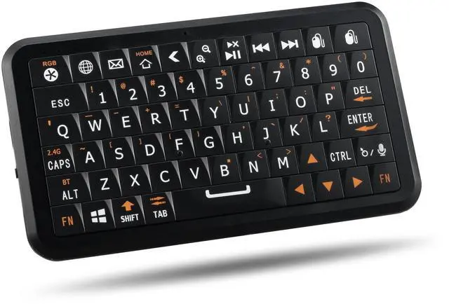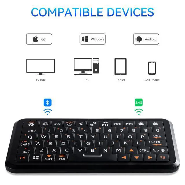 Key Design: Experience the iconic, satisfying snap of classic mobile keyboards with our unique solid-state keycaps. They deliver a precise and responsive typing feel that far surpasses soft silicone keys, making every keystroke both efficient and enjoyable ^^ Elevate your control beyond a standard keyboard. This all-in-one remote features an intuitive air mouse that turns natural hand movements into precise cursor control, offering a wider range of motion than a traditional touchpad. Coupled with responsive dedicated click buttons, it delivers seamless, touchpad-rivaling accuracy for effortless media browsing, dynamic presentations, or relaxed living room navigation ^^ 100-Hour Battery Life & USB-C Fast Charging: Power through weeks of use on a single charge. With an astonishing 100-hour battery life (backlight off), it outlasts standard wireless mini keyboard by over 5x. The fast-charging USB-C port provides hours of power in just minutes, so youre never left waiting ^^ Dual-Mode Connectivity & Smart RGB Backlight: Mini wireless keyboard switch effortlessly between Bluetooth 5.0 and a lag-free 2.4GH z USB receiver. Connect up to multi-device simultaneously and switch between them instantly. The smart ambient light sensor automatically activates the 7-color RGB backlight in low light, blending style with perfect visibility ^^
