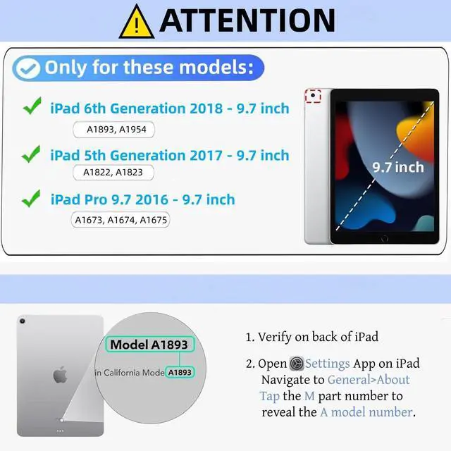 Compatibility Models: This keyboard case is compatible with iPad 9.7 Inch 6th Generation 2018 Release (Model A1893 /A1954); with iPad 5th Generation 2017 Release (Model A1822 /A1823); with iPad Pro 9.7 2016 Release (Model A1675 /A1674 /A1673). It will NOT work for any other model device ^^ 7
