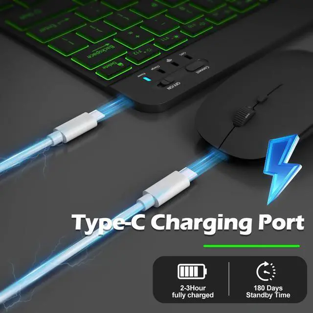 Keyboard and Mouse: This case features automatic sleep/wake functionality (only effective when the keyboard is removed) to extend device lifespan. It comes with a rechargeable keyboard and mouse, which can be fully charged in 2-3 hours using the included Type-C cable, providing up to 100 hours of use ^^